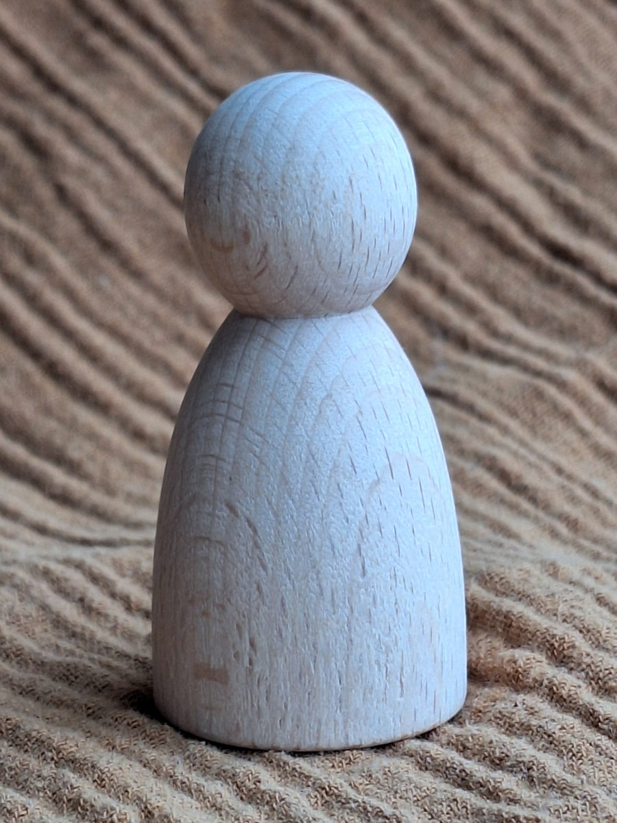 Één onbehandeld massief FSC-beukenhouten kegelpoppetje om zo mee te spelen in open einde en klein wereldspel of in de sensorische speelbak.