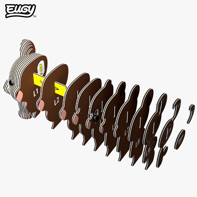 Eugy producten voldoen 100% aan de internationale veiligheidsnormen (EN71-1, 2, 3 en CPSIA). Een EUGY-pakket bevat 7 platte kaarten met individueel genummerde onderdelen, klaar om in elkaar te zetten.