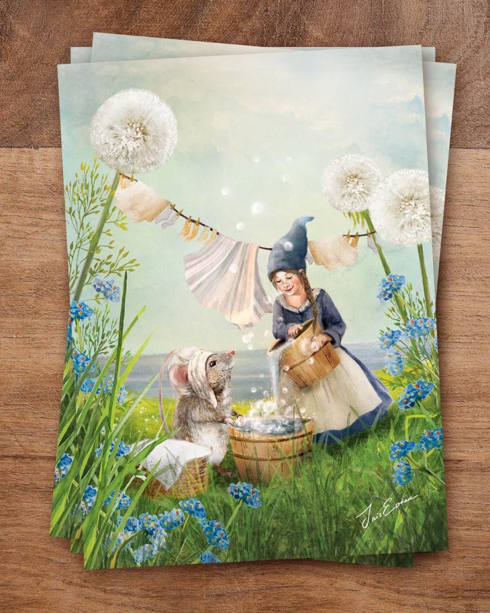 Laundry Days is een geïllustreerde ansichtkaart die de poëzie van alledaagse momenten viert. Geïnspireerd door klassieke kinderboeken waarin dagelijkse klusjes kleine avonturen worden, herinnert deze scène ons eraan dat zelfs de eenvoudigste taken gevuld kunnen zijn met zorg, gezelschap en stille vreugde.