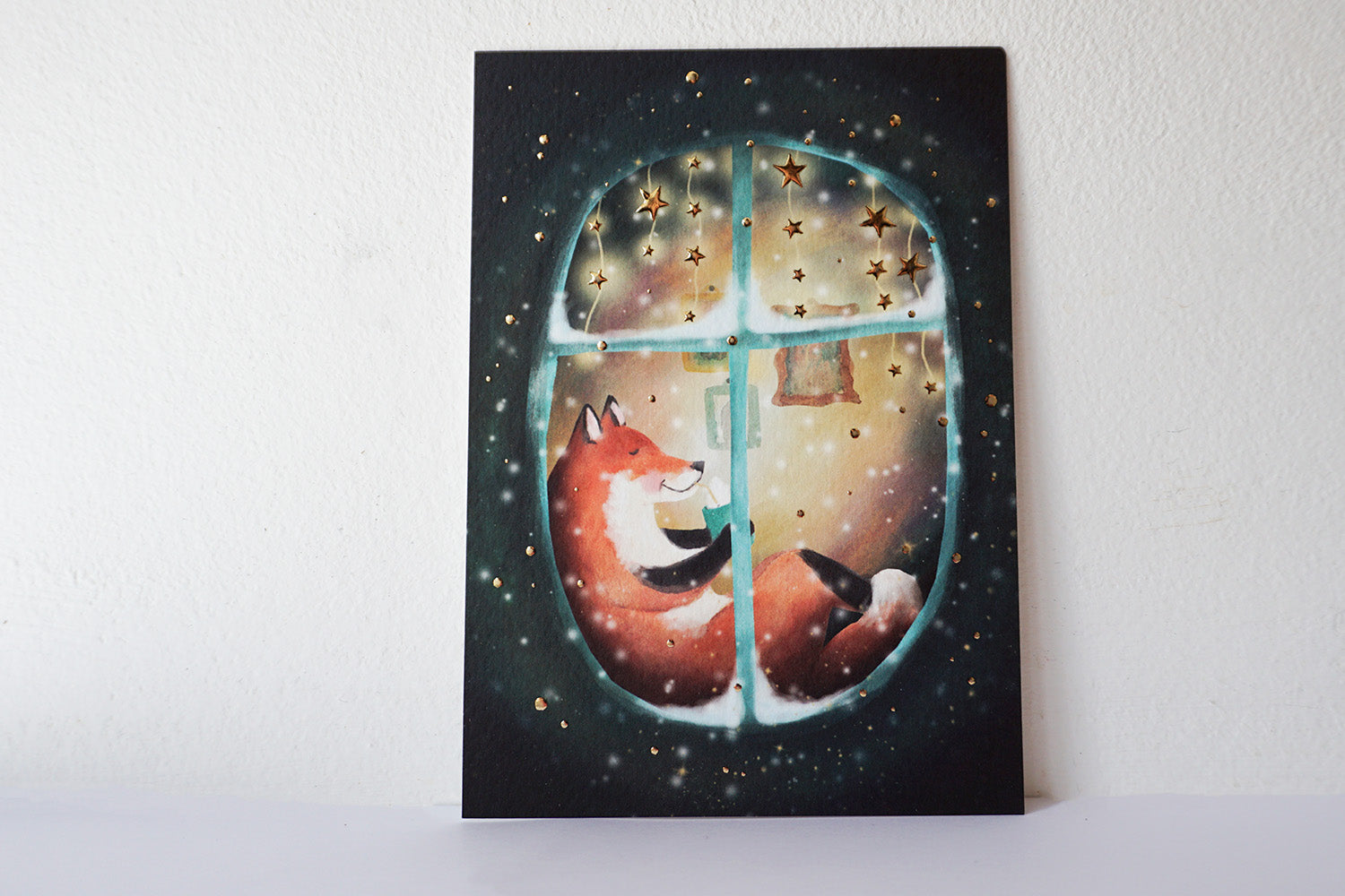 Betoverende winterkaart van een vos die lekker relaxt bij het raam met prachtige foliedruk!