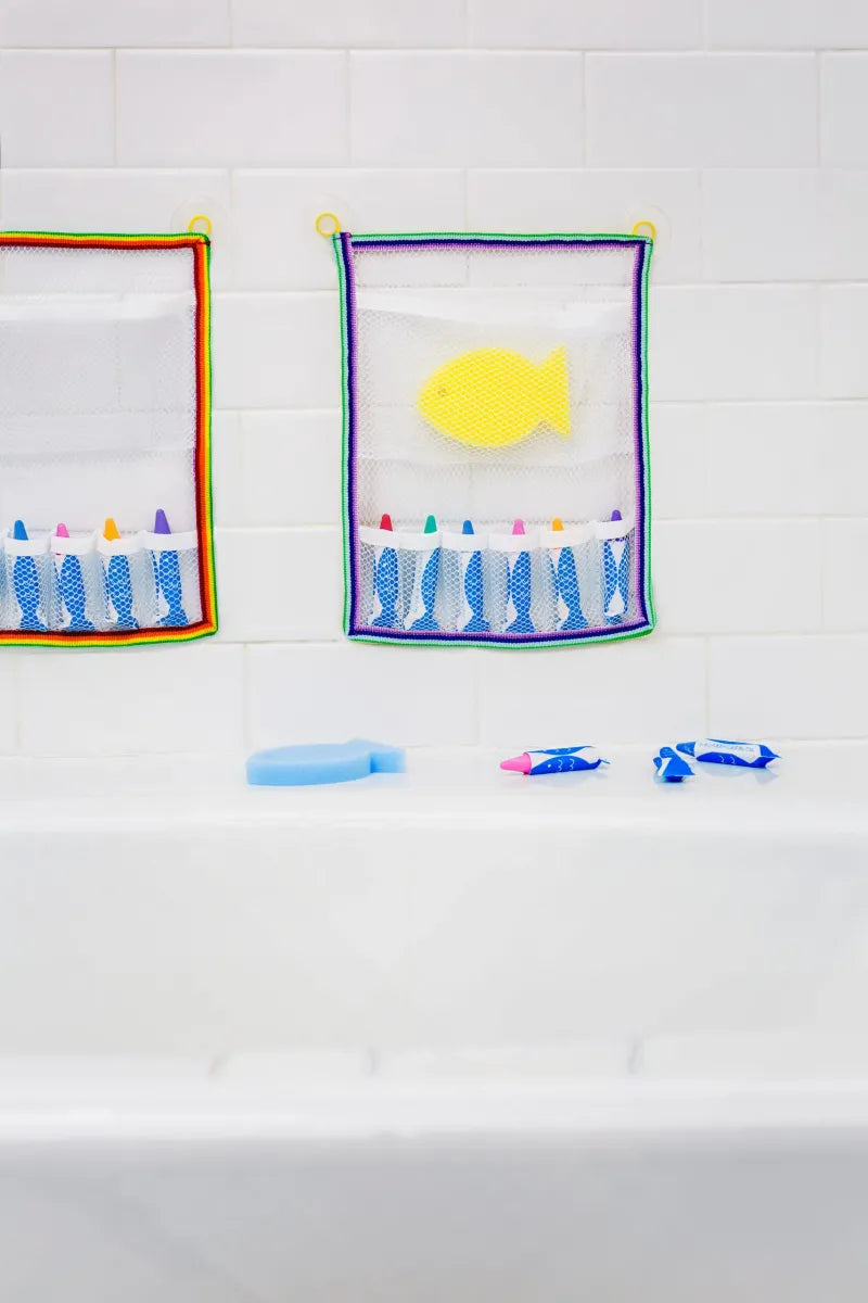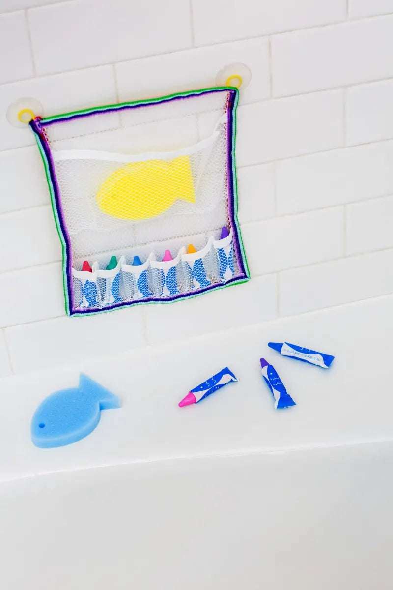 6 krijtjes inclusief gele spons in de vorm van een vis om na het kleuren in bad ook weer te zorgen voor een proper badje! Na gebruik kan je kindje de krijtjes opbergen in het bijgeleverde net.