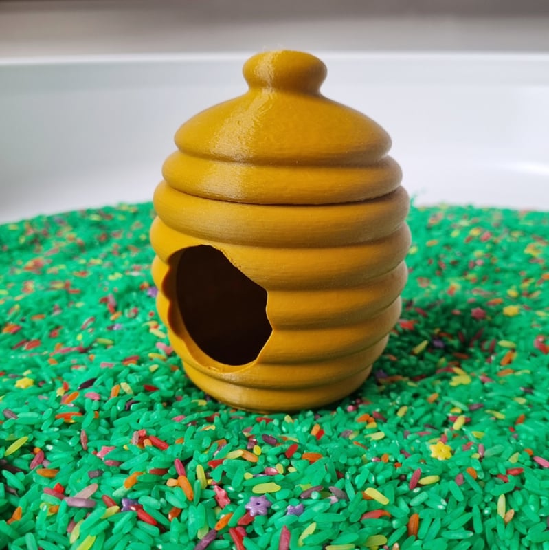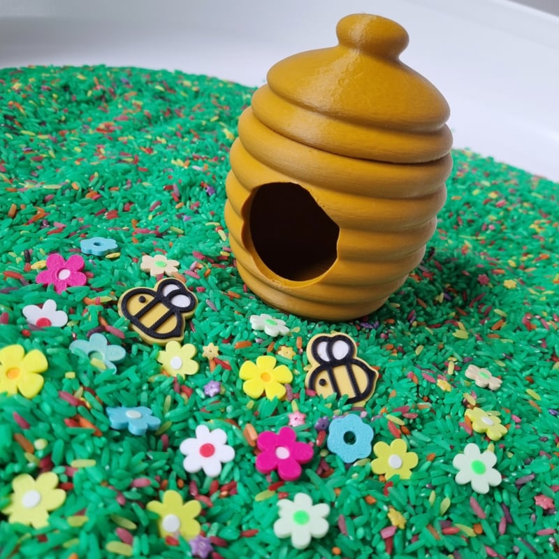 Combineer de bijenkorf met natuurlijke materialen zoals speelrijst, speelparels, steentjes of zand. Voeg dieren of kegelpoppetjes toe en laat kinderen hun eigen verhaal creëren. De opening aan de zijkant maakt de bijenkorf ideaal voor sensorisch spel en fijne motoriek.