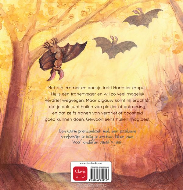 Met zijn emmer en doekje trekt Hamster eropuit. Hij is een tranenveger en wil zo veel mogelijk verdriet wegvegen. Maar algauw komt hij erachter dat je ook kunt huilen van plezier of ontroering, en dat zelfs tranen van verdriet of boosheid goed kunnen doen. Gewoon eens huilen mag best.