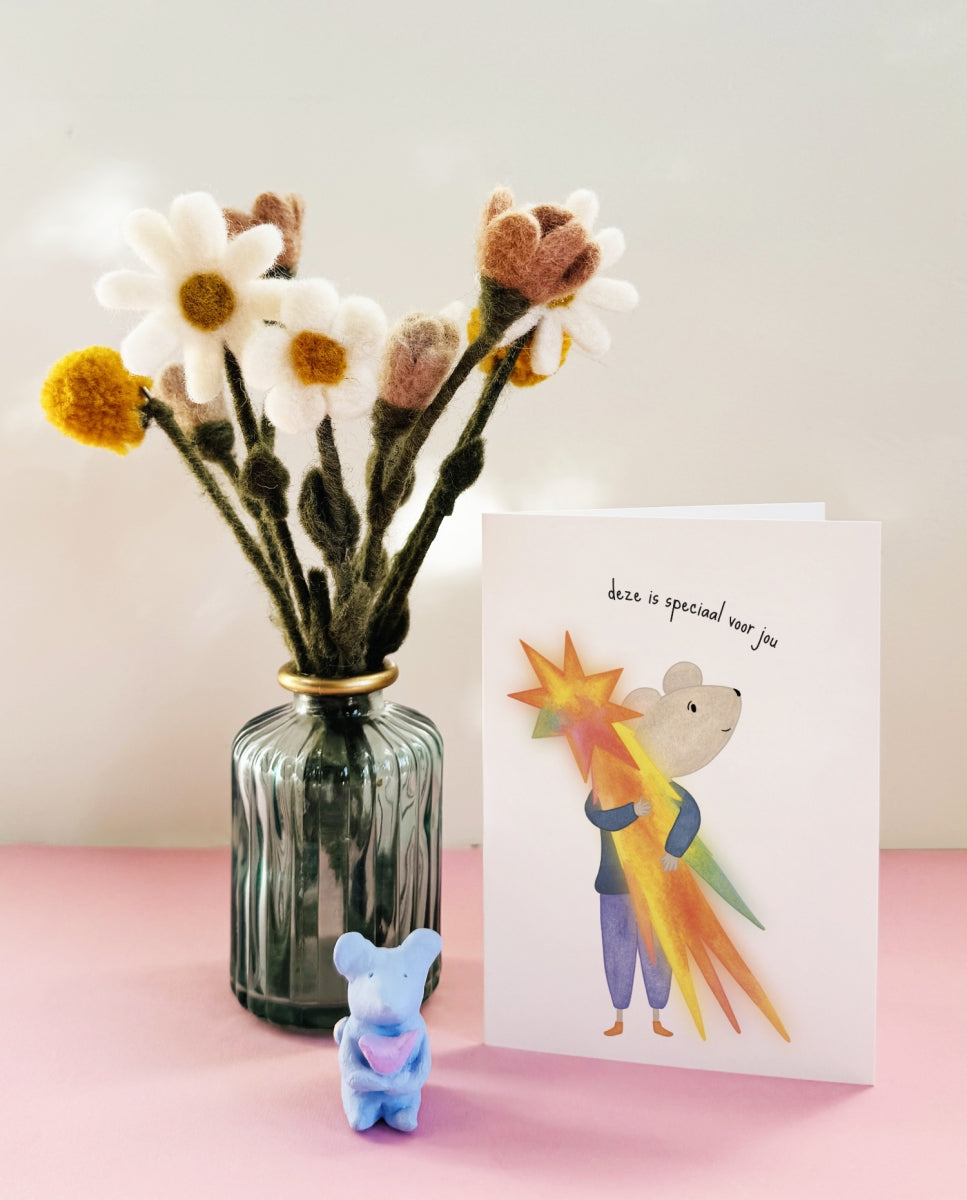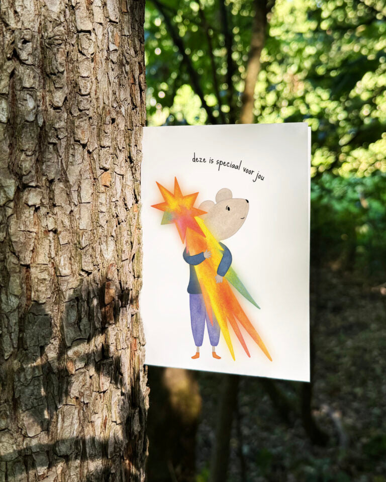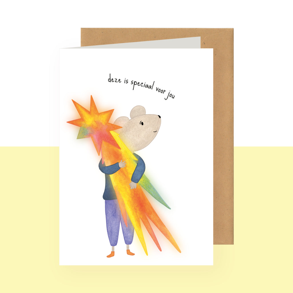 Een kaartje dat meteen een glimlach brengt. Met de vallende ster op de illustratie voelt dit kaartje als een kleine wens die je cadeau doet. Ideaal voor een verjaardag, een felicitatie, een dankjewel of gewoon zomaar. Dankzij de ster past het ook perfect bij de eindejaarsperiode, als alternatief voor een klassieke kerst- of nieuwjaarskaart. Eenvoudig, veelzijdig en altijd warm.