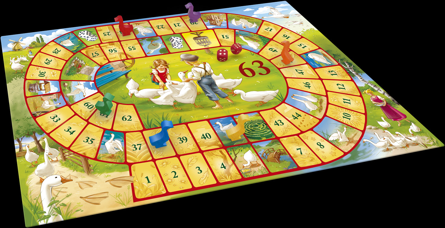Iedere speler kiest een gans en gooit ombeurten met de dobbelsteen. Zet je gans het aantal stapjes vooruit gelijk aan het aantal stippen op de dobbelsteen. Verschillende vakjes op het speelbord hebben verschillende gebeurtenissen! Met het ene vakje ga je flink wat stappen vooruit, met een ander vakje weer helemaal terug. De speler die als eerste precies op vakje 63 komt is de winnaar!