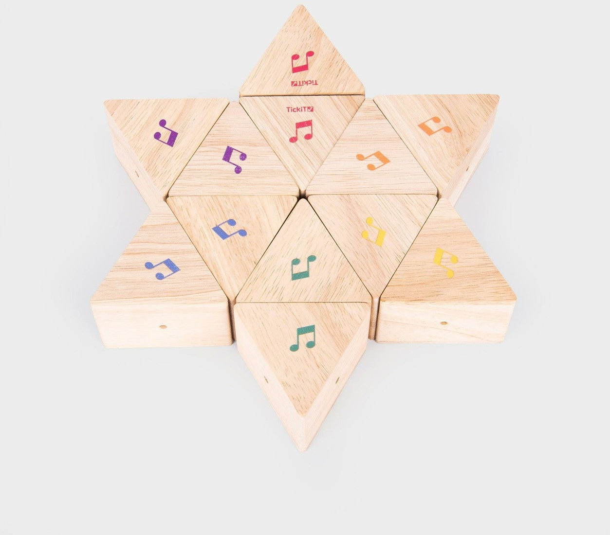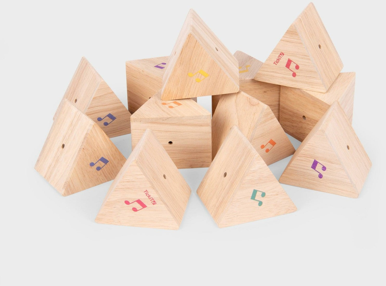 Deze tickit® Sound Prism Set bevat zes paar prachtige houten driehoekige prisma's.