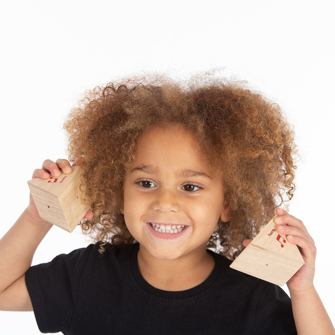 Elke hardhouten prisma heeft een gekleurd muzieknootlogo dat slechts aan één uiteinde van het blok verschijnt. Zo kan je kindje ze ondersteboven draaien en ontdekken welke blokken verschillende geluiden maken en in paren kan leren matchen.