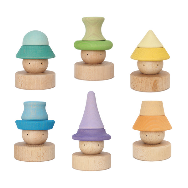 Met dit prachtige speelgoed kan je de stukken niet alleen op hun houten basis stapelen, maar ook verschillende figuren maken, afhankelijk van de volgorde waarin ze worden geplaatst. Alleen al door het gezicht om te draaien, krijg je een andere uitdrukking. Maar... wat zou er gebeuren als we de stukken buiten de basis zouden plaatsen? Of met losse onderdelen uit andere referenties? Het resultaat is de creatie van innemende karakters die tot leven komen in de handen van je kindje.