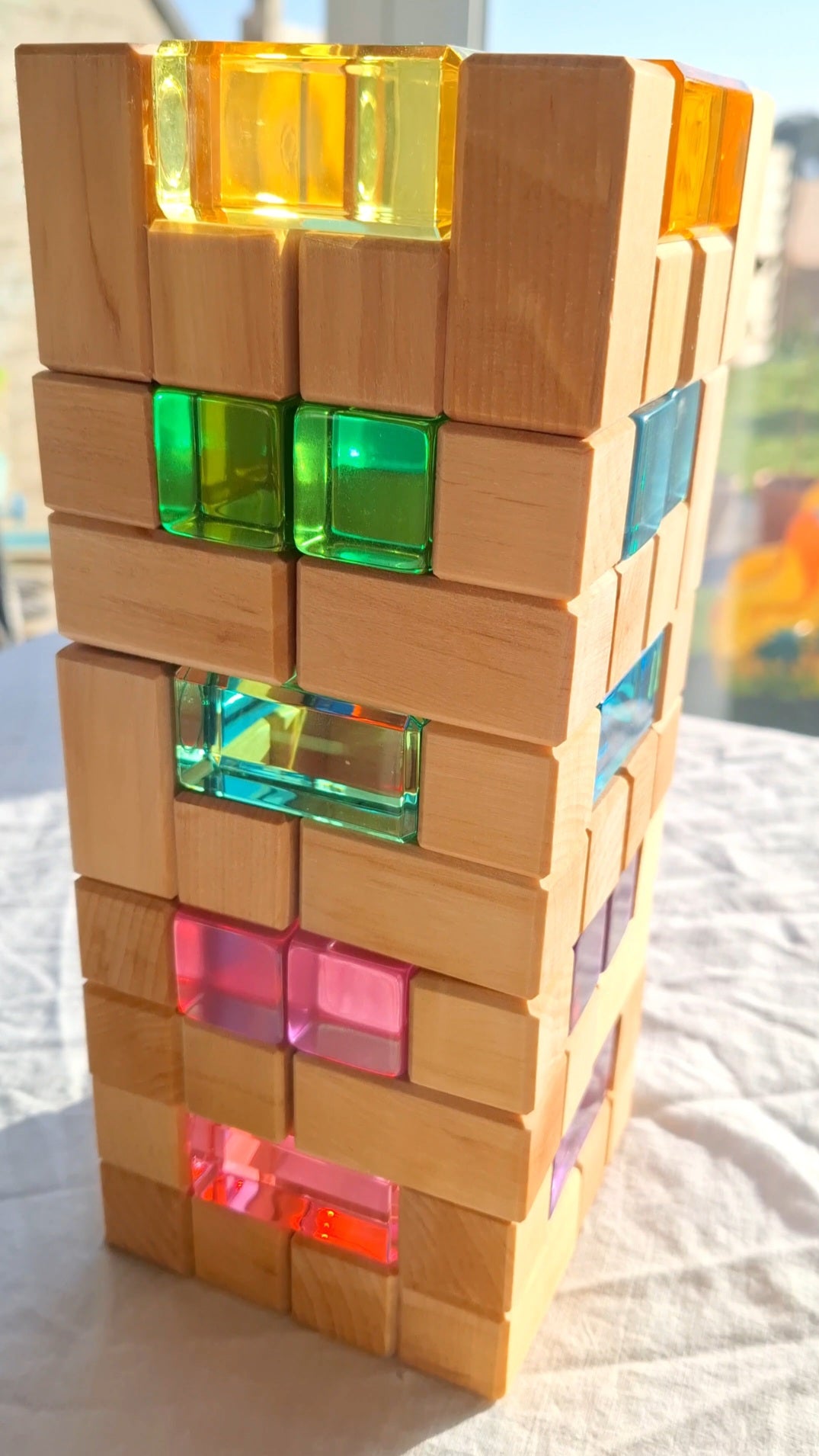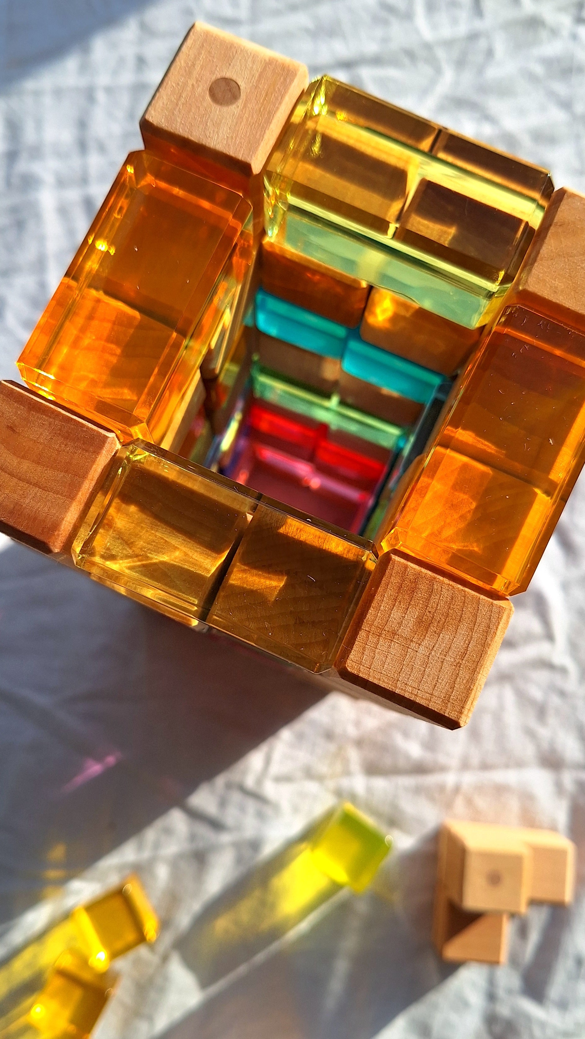 Fantastisch i.c.m. lucent cubes! De prachtige fonkelende lucent cubes in de allermooiste kleuren, steken schitterend af tegenover de natuurlijk houtskleur van deze hoekblokken.