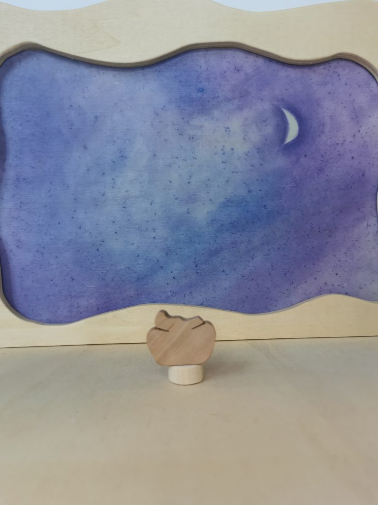 Deze steker is gemaakt van lokaal berken- of perenhout. Geverfd en afgelakt met speelgoedvriendelijke verf en hardwaxolie.