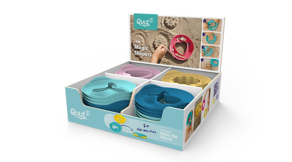 De Magic Shapers zijn een revolutionaire verbetering van klassiek speelgoed. Nooit meer met zand vullen en omdraaien. Beweeg de shaper en hij vult zich vanzelf! Geef het dan gewoon een tikje, hef de vorm op en voila, de vorm is klaar. En je shapers werken ook met sneeuw- of badbellen !! De vormen kunnen naar eigen verbeelding worden versierd en afgewerkt. Voeg ogen en versieringen toe om de vormen tot leven te brengen. Wat zullen ze worden? Een kwal, een koe of misschien zelfs een raket?