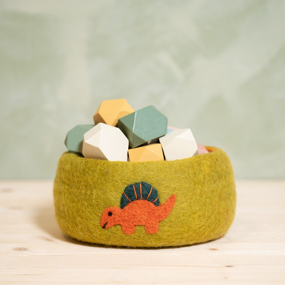 Een prachtig en stoer handgemaakt vilten mandje in de kleur groen met een spinosaurus erop.