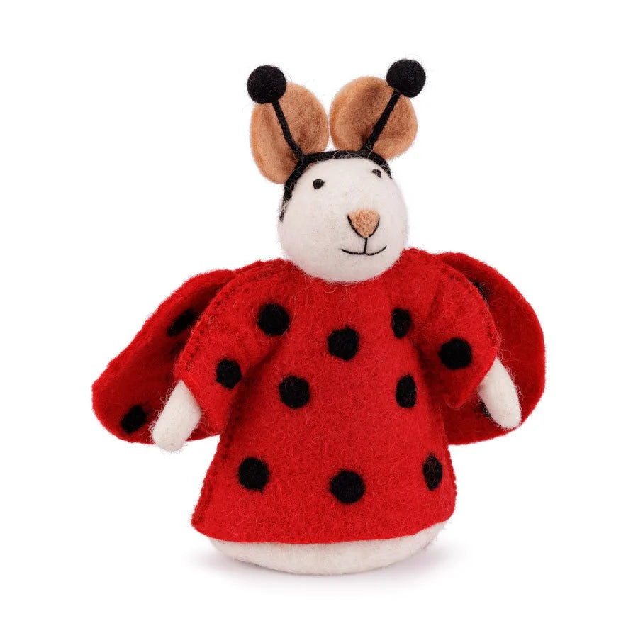 Een prachtige handgemaakte vilten muis verkleed als lief lieveheersbeestje.