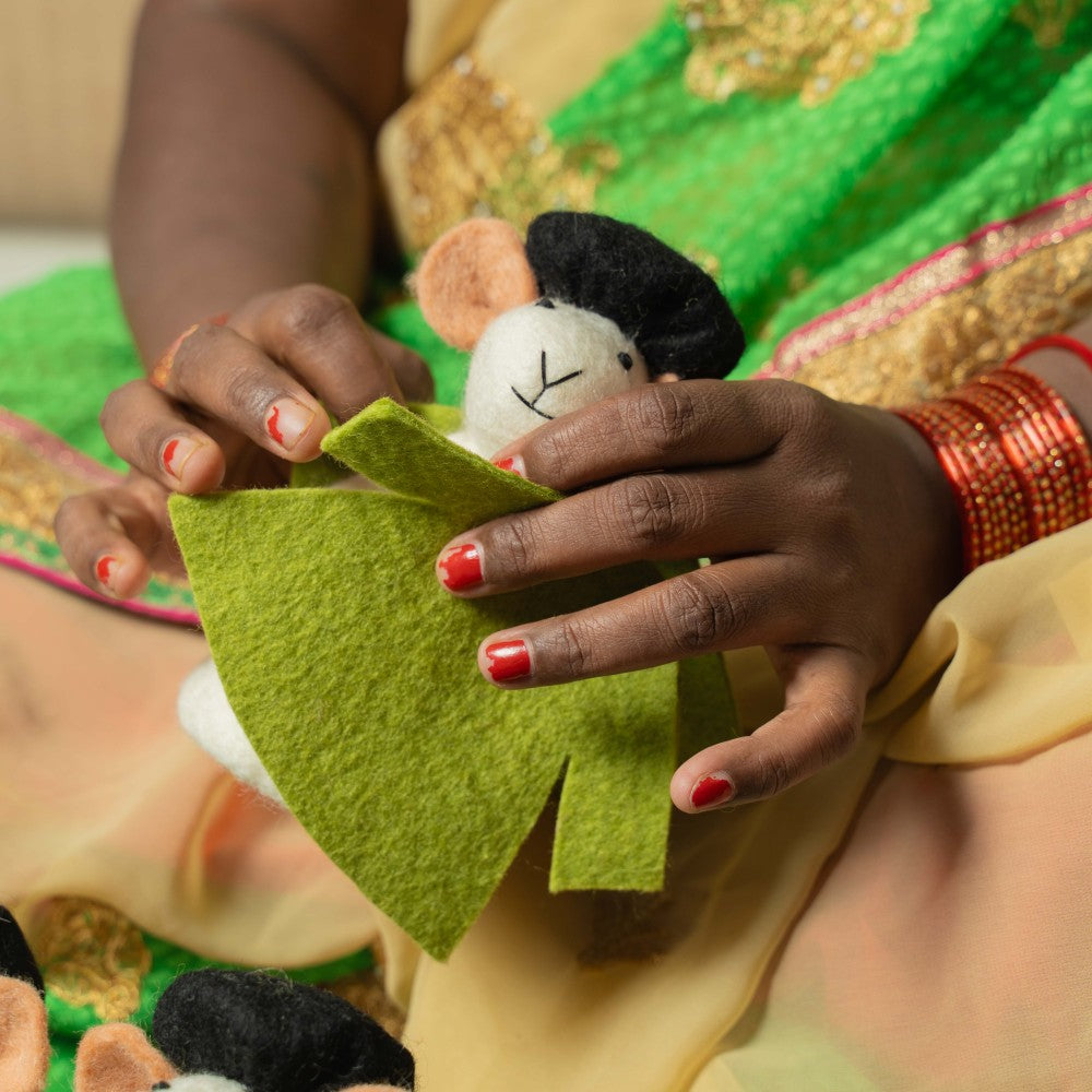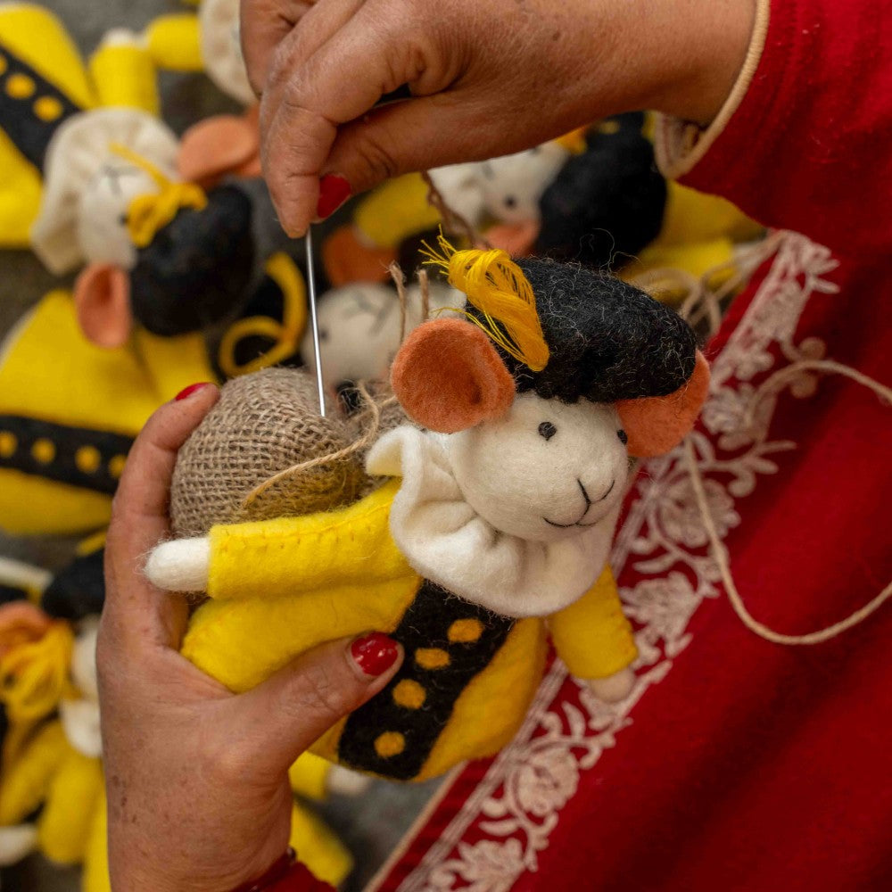 Een prachtige handgemaakte vilten muis verkleed als Piet, met een kleurrijk jasje en de zak van Sinterklaas op zijn rug.