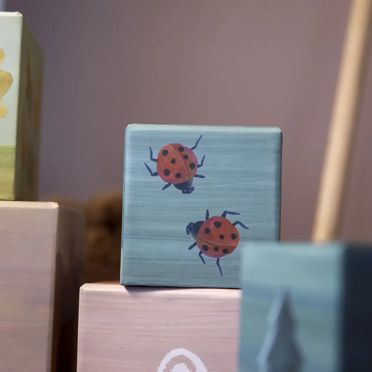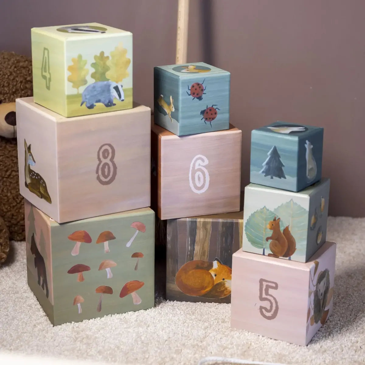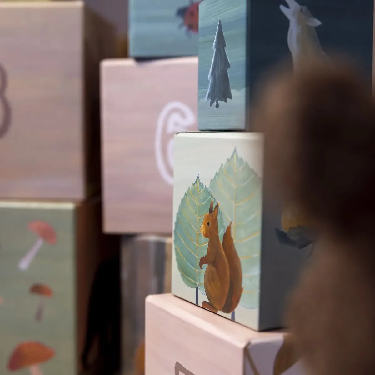 Stapel negen zacht beschilderde bosvriendjes op elkaar tot een wiebelige toren en kijk hoe ze er giechelend afdwarrelen. Elke kubus verbergt een ander bosdier – van een klein haasje tot een zachtaardige beer.