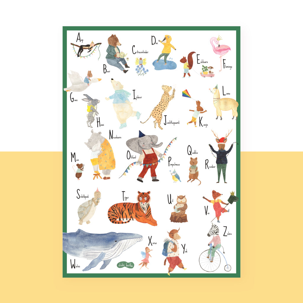 Met deze alfabet poster is het abc zo geleerd met prachtige illustraties van de bekende Studio Bertha-dieren.