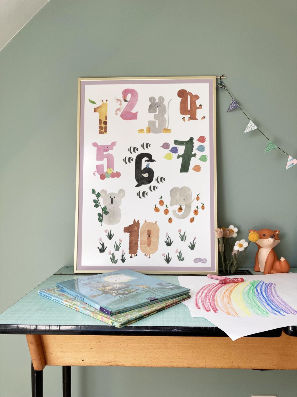 1,2,3,4 een cijferposter vol telplezier! Hang hem in de kinderkamer of geef hem een andere fijne plek in huis. Zoek samen met je kleine spruit naar dieren en alle cijfers van één tot tien.