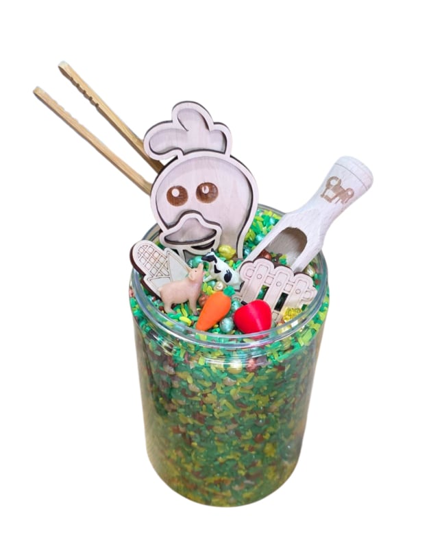Complete pot van 1250 ml gevuld met een volledig sensorisch speelthema: alles om meteen te beginnen met spelen, ontdekken en beleven.