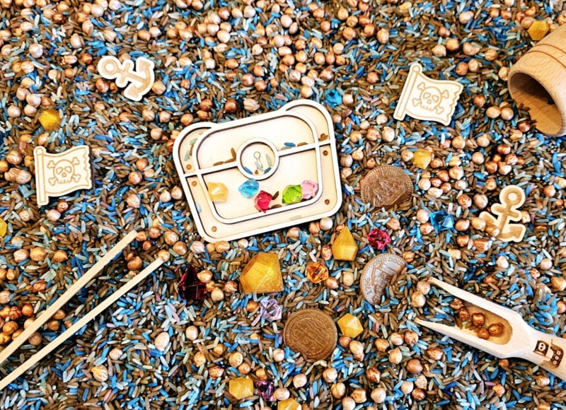 De speelparels worden gekleurd met niet giftige acrylverf. De speelrijst en speelpasta wordt gekleurd met azijn en voedselkleurstof.