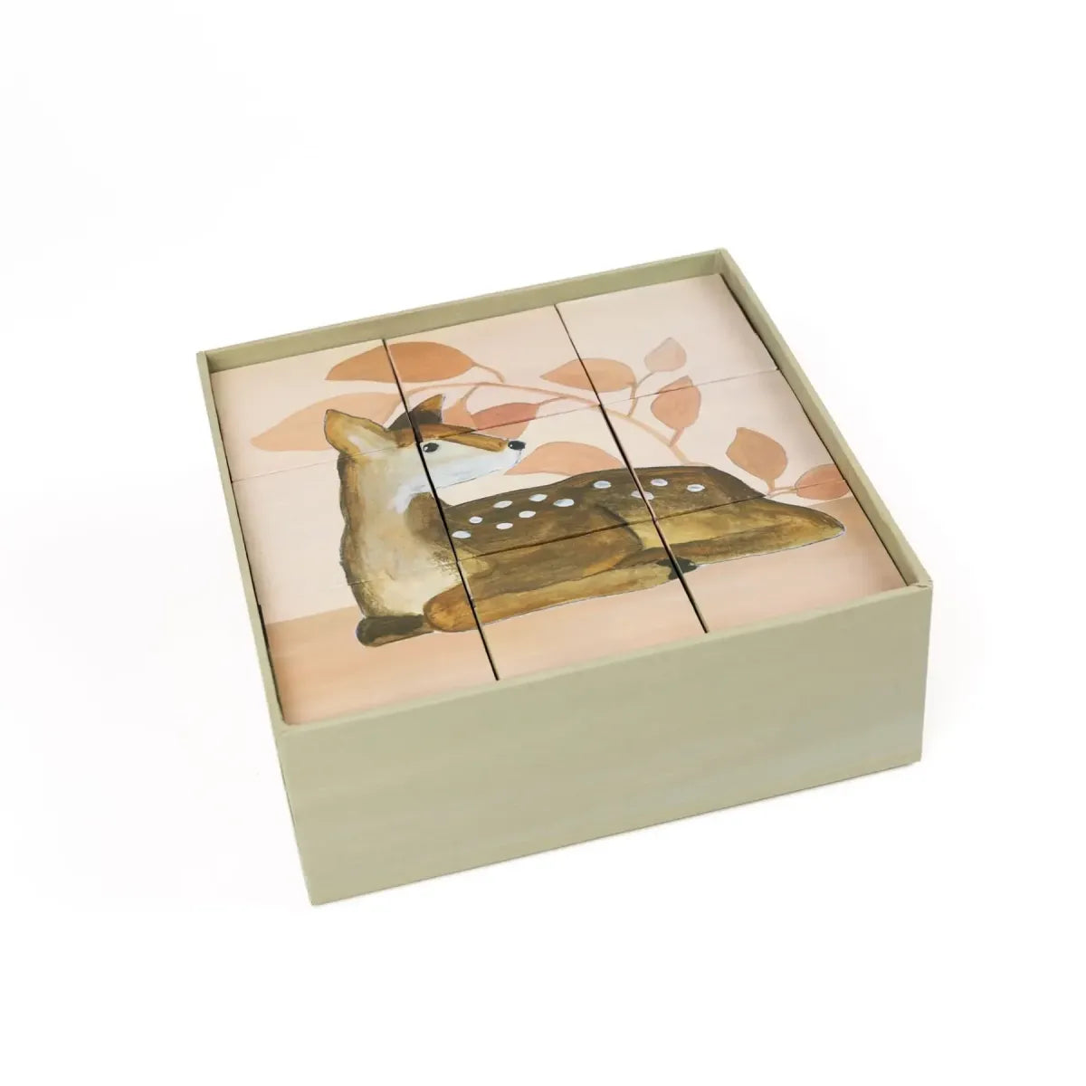 Kleine handjes leren spelenderwijs volgorde en coördinatie. Deze massief houten blokjes zijn voorzien van handgeschilderde bostaferelen in gedempte pasteltinten, gemaakt om talloze puzzelavonturen mee te maken.