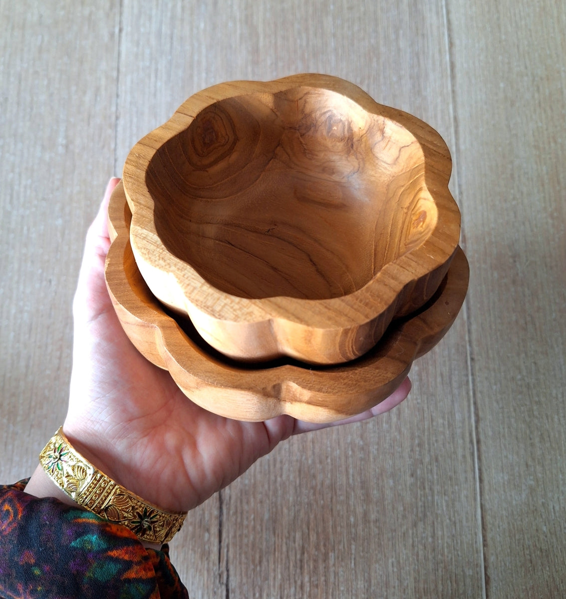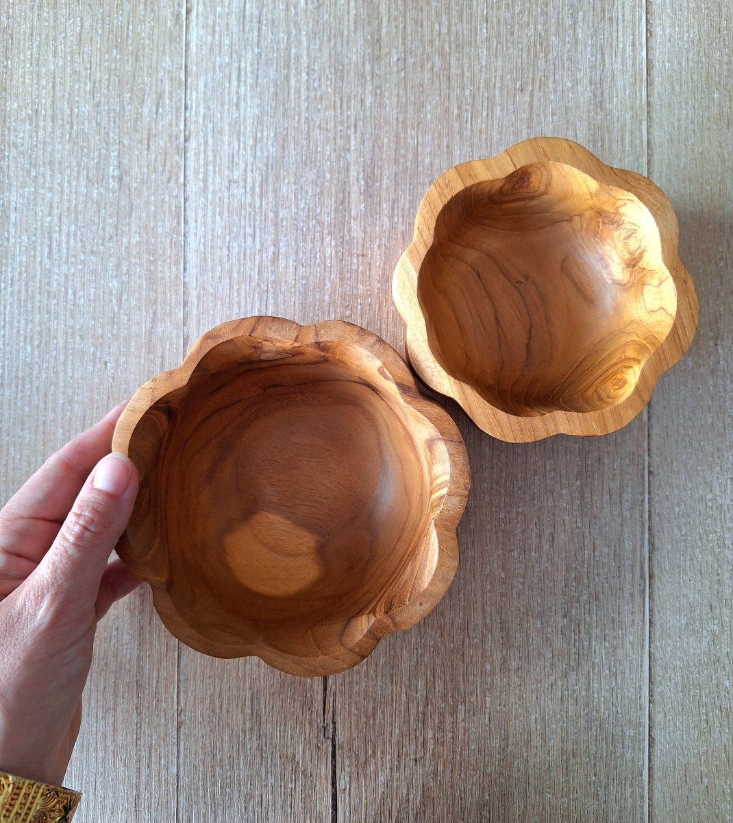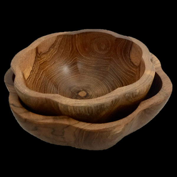 Een prachtige set handgemaakte massief teakhouten kommen in de vorm van bloemen. Een kleine en grote kom die ook in elkaar gezet kunnen worden.