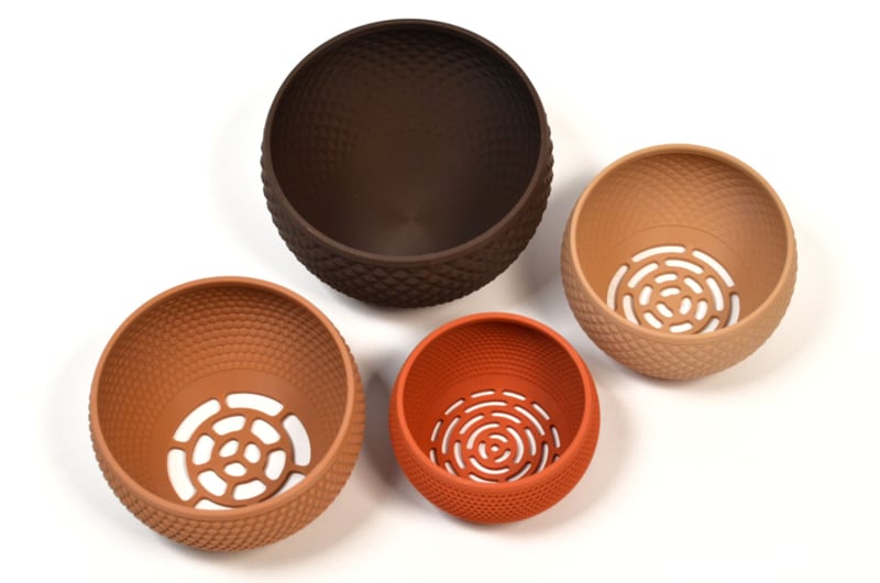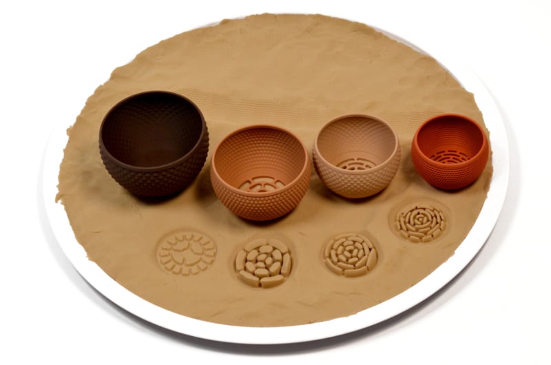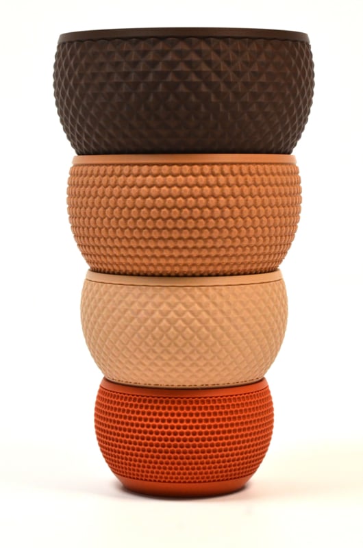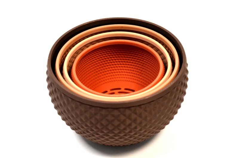 De set bestaat uit vier kommen in verschillende formaten. Drie daarvan hebben een unieke zeefbodem die ook als stempel gebruikt kan worden. De grootste kom heeft een gesloten onderkant met daarin een geïntegreerde stempel.