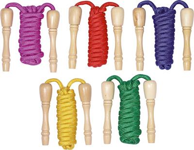 Prachtig inkortbaar springtouw in een fel kleurtje en houten handvaten die speciaal ontwikkeld werden voor kleine handen.