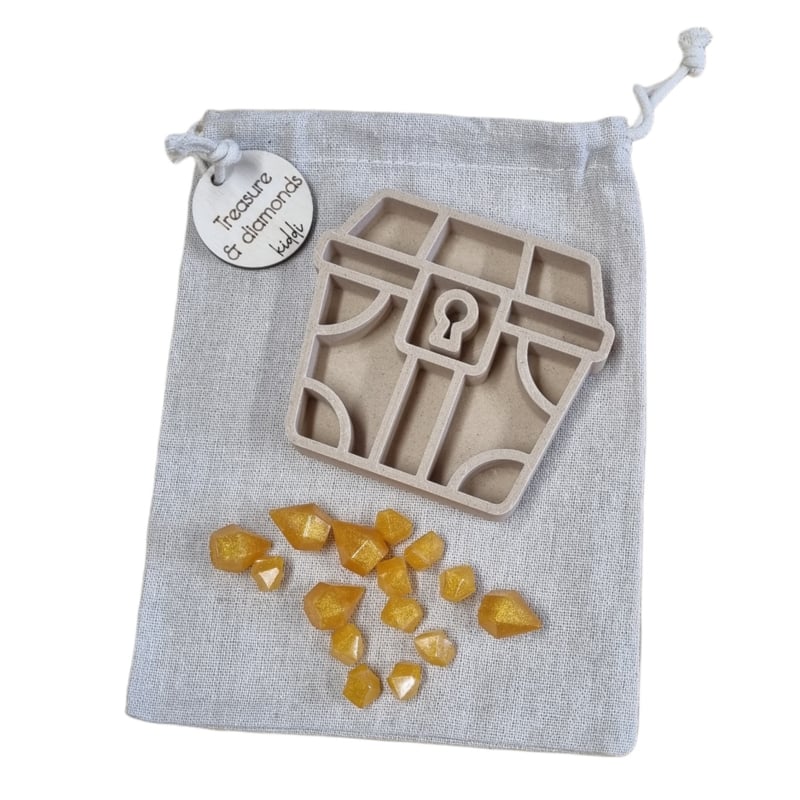 Een mini set met een bio PLA-vulvorm (met houtvezel) van een schatkistje en gouden hars diamantjes. Ga je mee op schattenjacht? Waar verstop je de diamantjes? in de klei / MagicSand / speelrijst / of in het water? de diamantjes kun je ook in de schatkist 'veilig' bewaren, sorteer op grootte en ga ze tellen. Hoeveel heb je er?