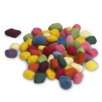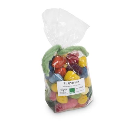 Een verpakking met ongeveer 65 viltkralen van ongeveer 2 x 2 cm in vele verschillende kleuren. De kleuren kunnen per verpakking verschillen, maar er is altijd een grote verscheidenheid aan geverfde kralen van vilt.