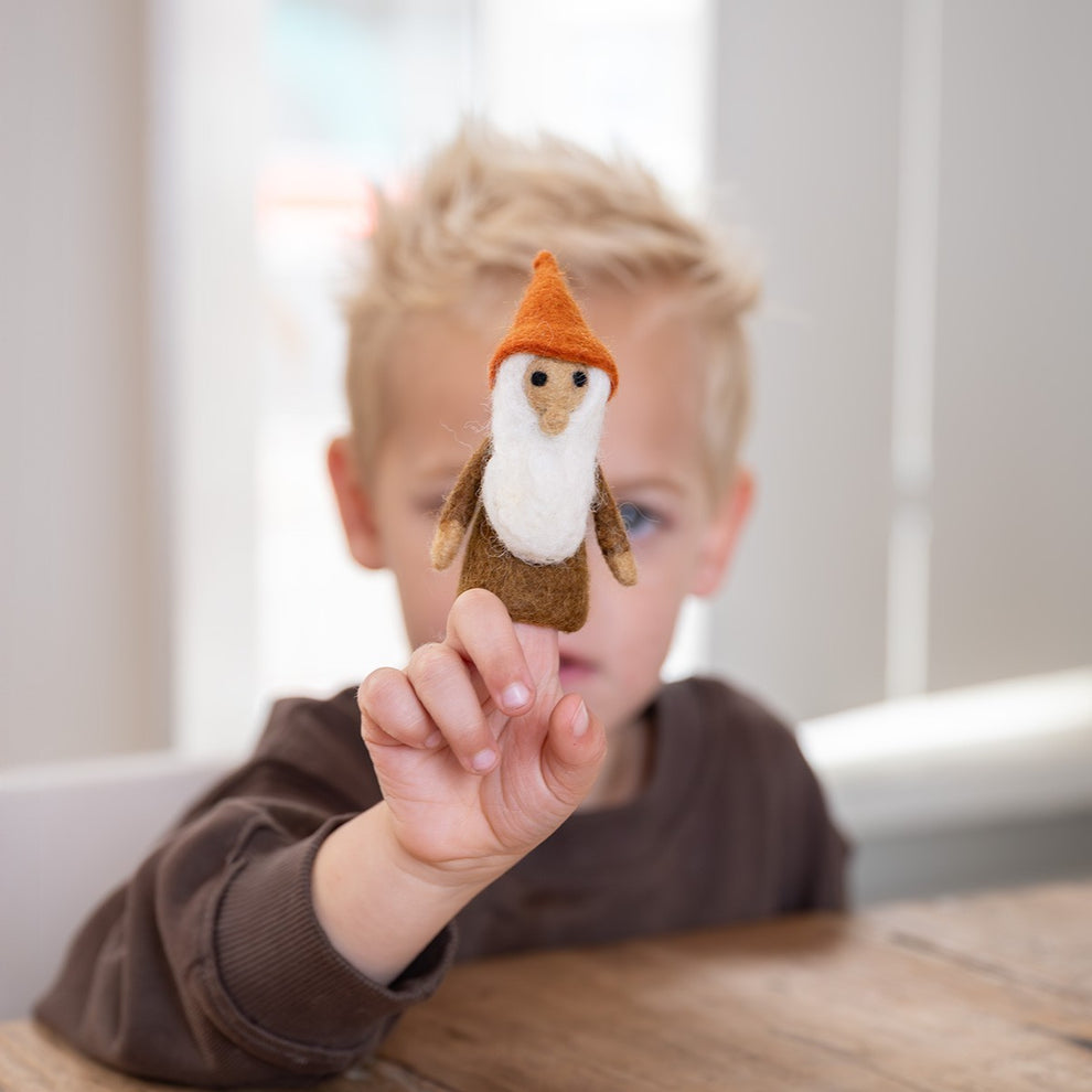Keuze uit een drie kleuren kaboutertjes als nieuwste generatie vingerpopjes: hoge kwaliteit wolvilten vingerpopje met massief vilten hoofdje.