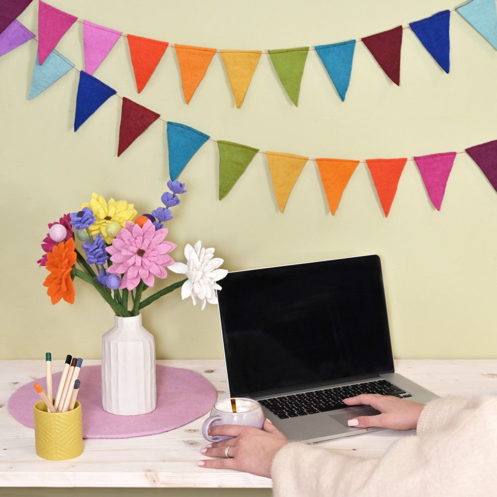 Slinger met vilten vlaggetjes in de kleuren van de regenboog.