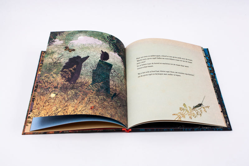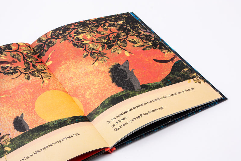 Het wordt donker en de grote en de kleine egel zijn op weg naar huis. Maar telkens moet de grote egel op de kleine egel wachten: er is nog zo veel te zien! De zonsondergang, de maan, de sterren. En dan wil de kleine egel natuurlijk ook de vissen nog welterusten wensen en de uilen goedenacht zwaaien ...