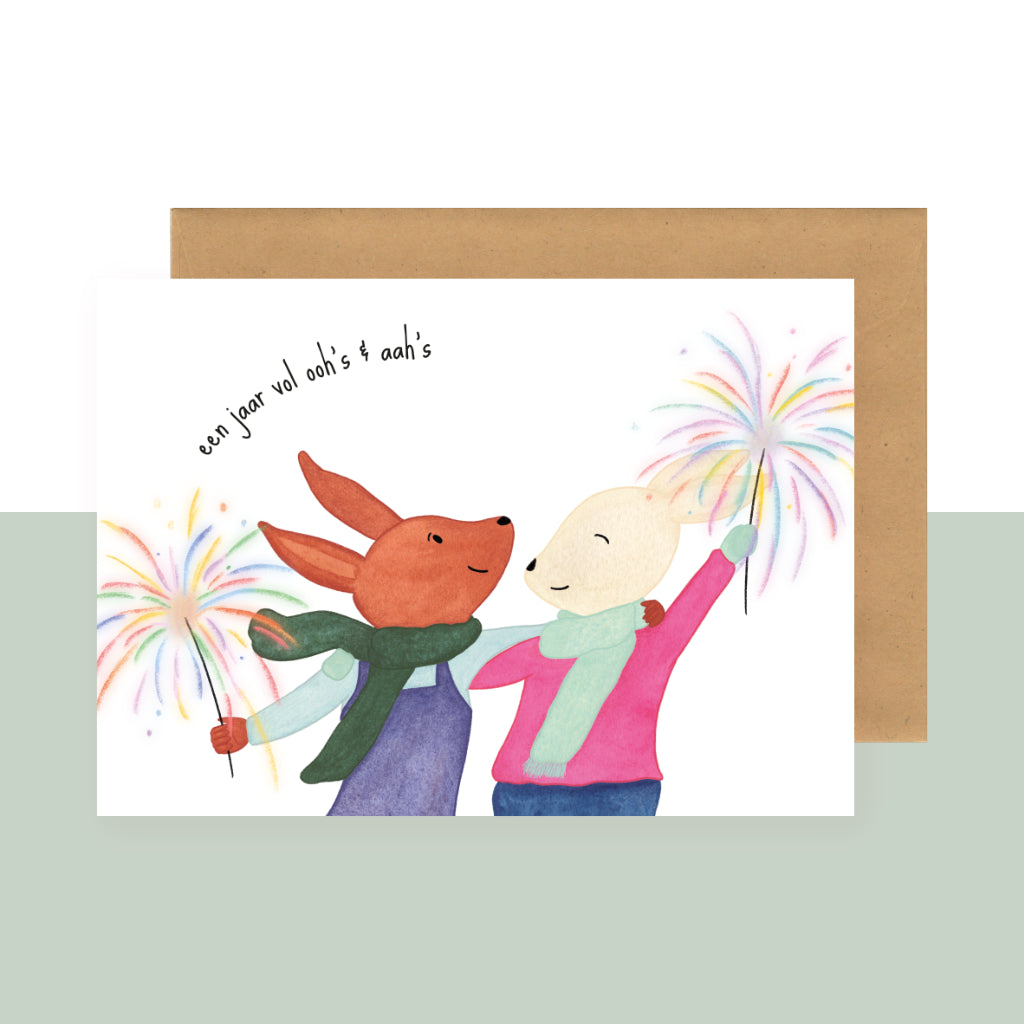 Met dit vrolijke kaartje wens je iemand een nieuw jaar vol verwondering, verrassingen en kleine gelukjes die je telkens doen glimlachen. Een knipoog naar vuurwerk en feest, maar evengoed naar alle magische momenten die nog komen. Perfect om te sturen als nieuwjaarskaart. Deze speelse boodschap laat het nieuwe jaar beginnen met een lach en een sprankel.