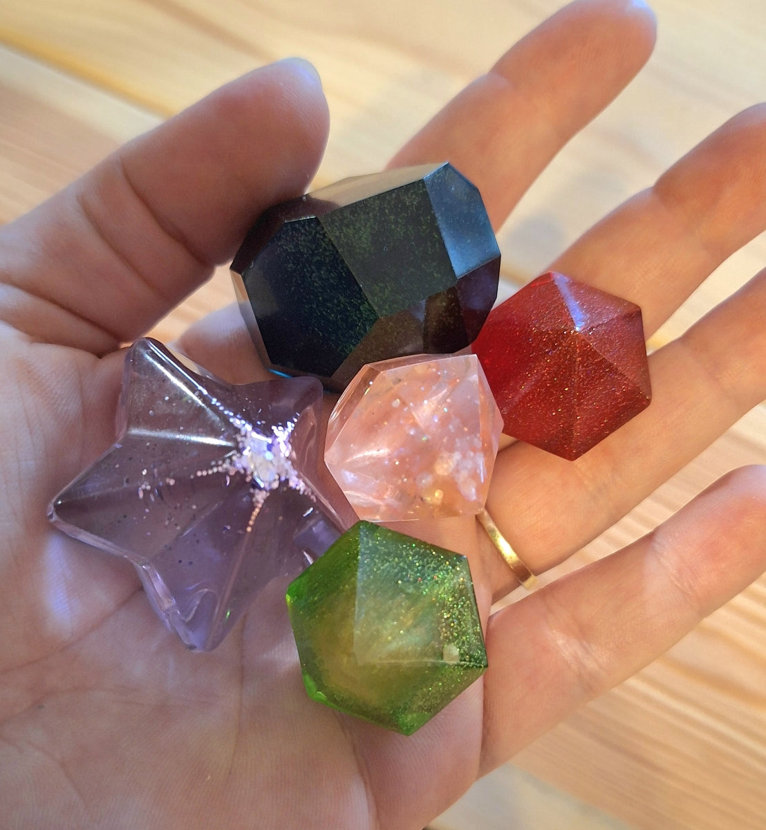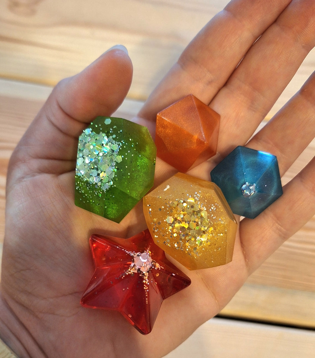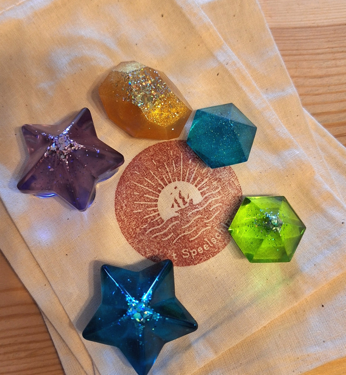 Een zakje met 5 prachtige handgegoten harsedelstenen. Fantastisch voor in de sensorische speelbak, waterspel en om op schattenjacht te gaan! Verzamel ze samen met andere schatten in een van onze prachtige houten schatkistjes.